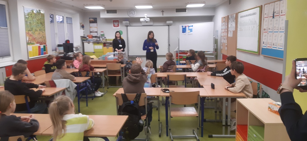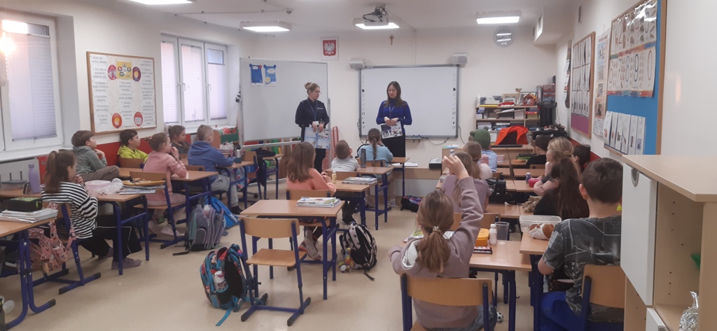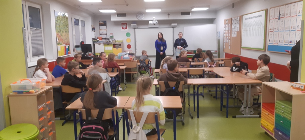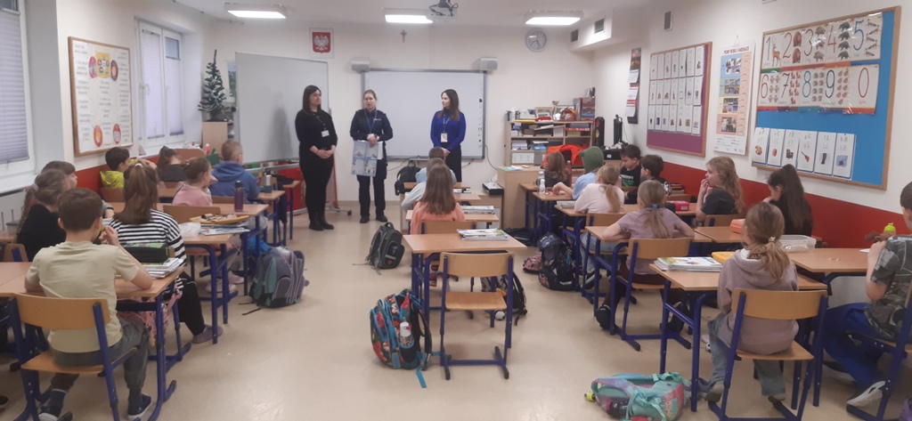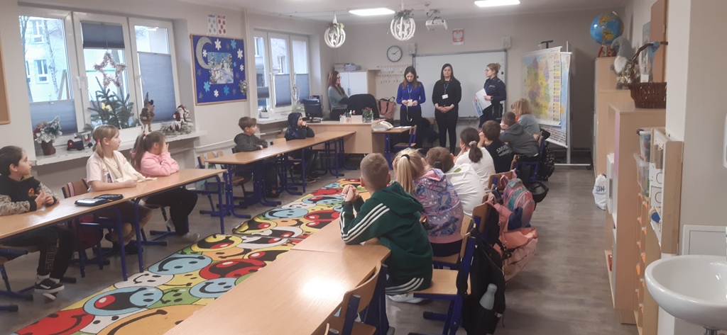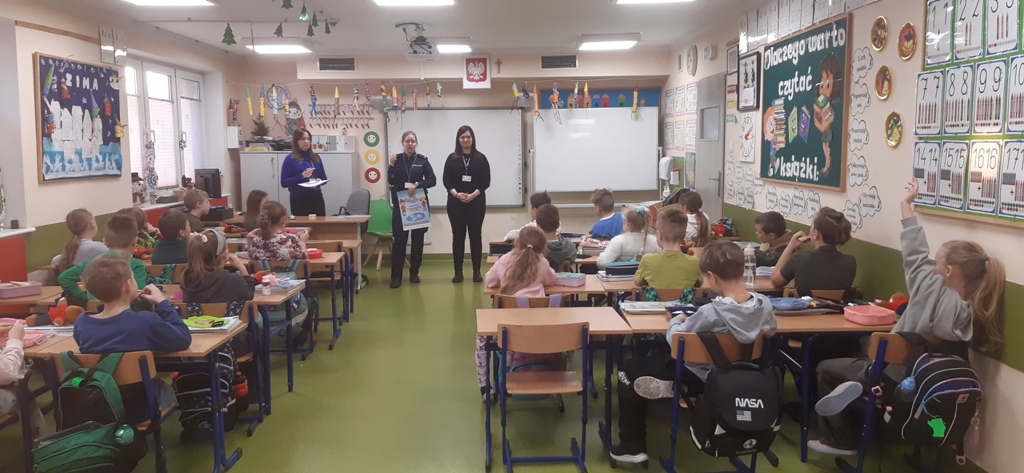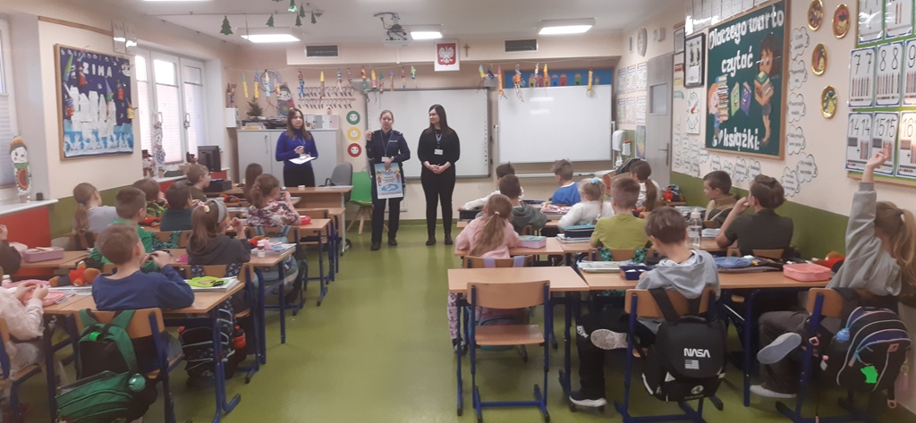 22 stycznia klasy pierwsze, drugie i trzecie szkoły podstawowej w Zespole Szkół im. I. Łukasiewicza w Policach odwiedzili specjalni goście: Pani Kornelia Staniszewska sierżant Policji w Policach oraz Panie z Powiatowej Stacji Sanitarno-Epidemiologicznej w Policach. Panie przypomniały dzieciom co to znaczy bezpiecznie bawić się zimą na śniegu: