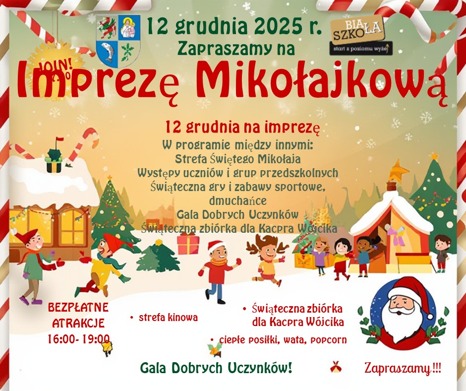 Serdecznie zapraszamy na Imprezę Mikołajkową, która odbędzie się w piątek 12 grudnia w godzinach 16:00-19:00 w Hala widowiskowo-sportowa Zespołu Szkół w Policach
